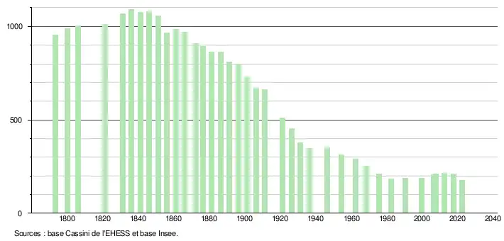 L'évolution du nombre d'habitants est connue à travers les recensements de la population effectués dans la commune depuis 1793. Pour les communes de moins de 10 000 habitants, une enquête de recensement portant sur toute la population est réalisée tous les cinq ans, les populations de référence des années intermédiaires étant quant à elles estimées par interpolation ou extrapolation[31]. Pour la commune, le premier recensement exhaustif entrant dans le cadre du nouveau dispositif a été réalisé en 2007[32].
