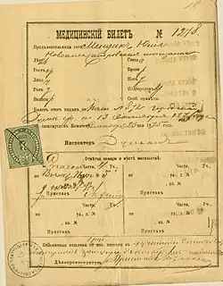 - ↑ Note: dans le contexte historique des documents d'identité le mot russe билет se traduit par « carte » ou « certificat ».