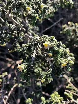 C’est un arbrisseau aux rameaux garnis de petites feuilles imbriquées, de 3-8 × 1,5-4 mm, ovales à lancéolées, charnues ou coriaces, brillantes dont la face inférieure est blanche-tomenteuse.