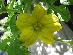 Les fleurs, solitaires, à corolle jaune pâle sont, comme sur la plupart des cucurbitacées soit mâles, soit femelles, mais toutes sont présentes sur le même pied (plante monoïque)[pas clair]. Elles ont 5 sépales et 5 pétales étalés et soudés à la base. La fleur mâle est portée par un pédicelle de 12–45 mm, velu, le tube du calice est densément velu, les étamines sont presque libres. La fleur femelle, portée par un pédicelle de 3 à 45 mm, possède un calice et une corolle comme celui et celle du mâle, un ovaire de 5–8 mm velu, 3 stigmates réniformes.