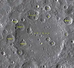 Le cratère Pasteur possède un certain nombre de cratères satellites identifiés avec des lettres.