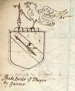 En 1602, le York Herald (en) Ralph Brooke accuse le Garter King of Arms (en) William Dethick (en) d'avoir élevé à la noblesse 23 personnes qui n'en étaient pas dignes, parmi lesquelles le père de Shakespeare[85]. Celui-ci avait déposé une demande d'armoiries trente-quatre ans plus tôt, mais n'avait été exaucé qu'en 1596, après les premiers succès de son fils[86]. La plainte de Brooke inclut un croquis des armoiries de Shakespeare, avec pour légende « Shakespear ye Player by Garter[87] ». Les armoiries accordées sont défendues par Dethick et William Camden, antiquaire réputé et Clarenceux King of Arms (en)[88]. Dans son Remaines Concerning Britaine (1605), Camden décrit Shakespeare comme l'un des « plus brillants esprits de ce temps, que les ères futures admireront à raison[89] ».