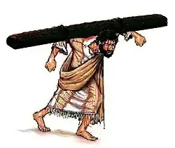 En réalité, le poteau vertical, appelé stipes, était généralement fixé de manière permanente dans la terre à l'emplacement de l'exécution. Le condamné était forcé de porter le patibulum de la prison jusqu'au lieu d'exécution. Les condamnés le portaient en travers des épaules, les avant-bras attachés au bois par des cordes. Il pesait de 37 à 75 kilos selon les dimensions et le bois utilisé[5], fardeau écrasant pour un homme. Jésus a donc vraisemblablement été chargé du patibulum et non de la croix entière lors la montée du Golgotha[6].