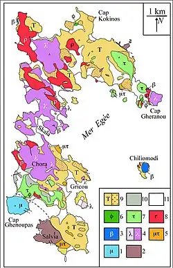 Depuis la fin de l'activité magmatique il y a 3,7 millions d'années, l'érosion a remodelé l'île et les anciens volcans ne sont plus identifiables, à part un cratère d'explosion situé à l'est de Grikou, signalé par la présence de bombes volcaniques basaltiques[9]. Les coulées de lave, généralement peu épaisses, peuvent être séparées par des couches de scories. L'île présente aussi des faciès microgrenus trachytiques, recoupés par des filons (μτ sur la carte). Les laves sont essentiellement des rhyolites(ρ), des trachytes et trachytes quartzifères (τ), des latites (λ ou hy) et des latites quartziques (λ', contenant de la tridymite), accompagnés de petits volumes de basaltes(β) et de phonolites(φ)[10]. Les pyroclastites (Τ) sont très abondantes, spécialement à l'est de l'île; elles n'ont pas été décrites en détail. Les plus fines peuvent représenter des dépôts d'éruptions pliniennes.