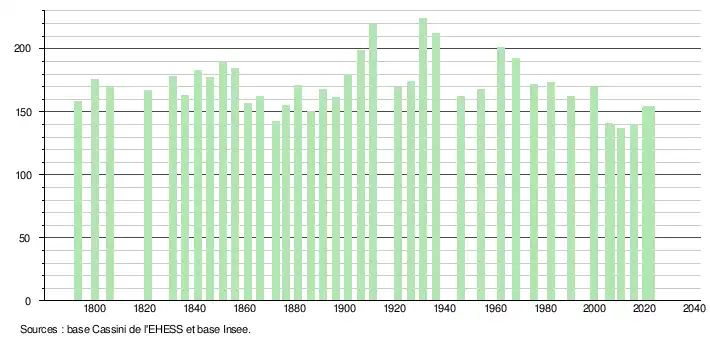 L'évolution du nombre d'habitants est connue à travers les recensements de la population effectués dans la commune depuis 1793. Pour les communes de moins de 10 000 habitants, une enquête de recensement portant sur toute la population est réalisée tous les cinq ans, les populations de référence des années intermédiaires étant quant à elles estimées par interpolation ou extrapolation[13]. Pour la commune, le premier recensement exhaustif entrant dans le cadre du nouveau dispositif a été réalisé en 2005[14].