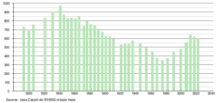 | L'évolution du nombre d'habitants est connue à travers les recensements de la population effectués dans la commune depuis 1793. Pour les communes de moins de 10 000 habitants, une enquête de recensement portant sur toute la population est réalisée tous les cinq ans, les populations de référence des années intermédiaires étant quant à elles estimées par interpolation ou extrapolation[26]. Pour la commune, le premier recensement exhaustif entrant dans le cadre du nouveau dispositif a été réalisé en 2007[27]. En 2022, la commune comptait 601 habitants[Note 2], en évolution de −4,75 % par rapport à 2016 (Gers : +1,04 %, France hors Mayotte : +2,11 %). |