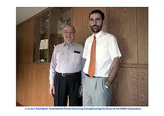 Paul Baran est né en 1926 à Grodno, dans une famille juive polonaise qui migre aux États-Unis deux ans plus tard. En 1949, il obtient son diplôme d'ingénieur en électricité puis un diplôme d'ingénieur en informatique en 1959[6]. C'est en 1964 qu'il publie ses premiers résultats sur la communication de données par paquets, préfigurant les bases du réseau militaire ARPANET[7] ainsi que le principe de transmission par ADSL[8].