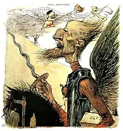 Paul Déroulède a une position plutôt changeante sur l'antisémitisme. Lorsqu'il rejoint le boulangisme, il est plutôt un « ami des juifs » et l'un des seuls à condamner La France juive d'Édouard Drumont[50]. Cependant, après avoir rejoint le boulangisme, Déroulède tient des déclarations antisémites à plusieurs reprises[8],[11] et utilise le ressort de l'antisémitisme pour mobiliser les masses[12]. L'ambiguïté est renforcé par sa présence à la réunion ouvertement antisémite organisée par Francis Laur le 18 janvier 1890, où il prononce un discours virulents envers les juifs et notamment Joseph Reinach, tout en défendant Naquet[51]. Pourtant, pour les élections municipales d'avril, il propose une campagne résolument en opposition à l'antisémitisme, influençant Boulanger pour ne pas faire alliance avec Drumont et Morès[52].