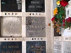 - ↑ Mairie du 16e arrondissement, « Acte de décès n° 1031 du 18/05/1935 photo 14/31 16D 150 », sur Archives de Paris (consulté le ) : « décédé le 17/05/1935 à 23h45, Paul Abraham Dukas, compositeur de musique, Officier de la Légion d'honneur, né à Paris le 01/10/1865, fils de Jules Jacob Dukas et Eugénie Gompertz, époux de Mazulée Suzanne Dinah Pereyra »