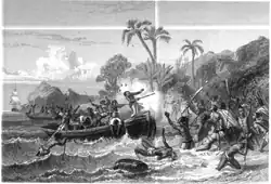 Dès lors, une véritable bataille commença entre l'équipage et ses agresseurs. Onze marins furent tués sur place, vingt furent blessés et Fleuriot de Langle fut achevé à coups de massue[12].