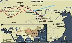 La plus fameuse de ces missions est celle de 1906 à 1908 dans le Turkestan chinois [14]: parti en train de Paris le pour Saint-Pétersbourg avec deux compagnons de voyage, le docteur Louis Vaillant [15] et le photographe Charles Nouette [16]. Pelliot retrouve fin juillet 1906, suivant les ordres militaires, à Boukhara, le colonel finlandais Gustaf Mannerheim, officier de l'armée impériale russe, en mission d'espionnage pour le Tsar Nicolas II, lequel avait des visées territoriales sur l'ouest chinois[17],[18]. Associés pendant trois mois, leur route se sépare fin octobre 1906 à Kashgar.