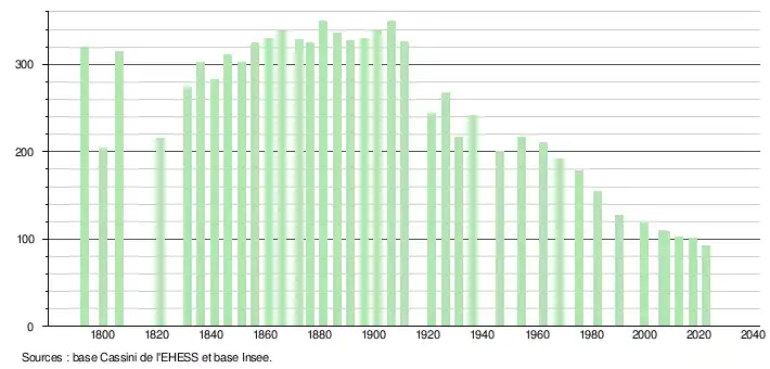 L'évolution du nombre d'habitants est connue à travers les recensements de la population effectués dans la commune depuis 1793. Pour les communes de moins de 10 000 habitants, une enquête de recensement portant sur toute la population est réalisée tous les cinq ans, les populations de référence des années intermédiaires étant quant à elles estimées par interpolation ou extrapolation[22]. Pour la commune, le premier recensement exhaustif entrant dans le cadre du nouveau dispositif a été réalisé en 2007[23].