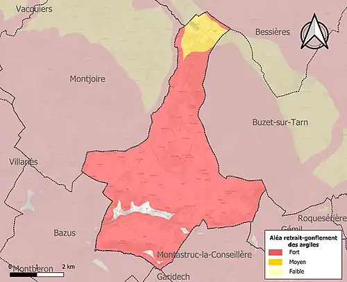 Le retrait-gonflement des sols argileux est susceptible d'engendrer des dommages importants aux bâtiments en cas d’alternance de périodes de sécheresse et de pluie. 97,2 % de la superficie communale est en aléa moyen ou fort (88,8 % au niveau départemental et 48,5 % au niveau national). Sur les 453 bâtiments dénombrés sur la commune en 2019, 453 sont en aléa moyen ou fort, soit 100 %, à comparer aux 98 % au niveau départemental et 54 % au niveau national. Une cartographie de l'exposition du territoire national au retrait gonflement des sols argileux est disponible sur le site du BRGM[23],[Carte 3].