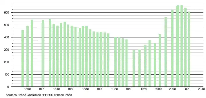 L'évolution du nombre d'habitants est connue à travers les recensements de la population effectués dans la commune depuis 1793. Pour les communes de moins de 10 000 habitants, une enquête de recensement portant sur toute la population est réalisée tous les cinq ans, les populations de référence des années intermédiaires étant quant à elles estimées par interpolation ou extrapolation[21]. Pour la commune, le premier recensement exhaustif entrant dans le cadre du nouveau dispositif a été réalisé en 2007[22].