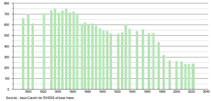 L'évolution du nombre d'habitants est connue à travers les recensements de la population effectués dans la commune depuis 1793. Pour les communes de moins de 10 000 habitants, une enquête de recensement portant sur toute la population est réalisée tous les cinq ans, les populations de référence des années intermédiaires étant quant à elles estimées par interpolation ou extrapolation[27]. Pour la commune, le premier recensement exhaustif entrant dans le cadre du nouveau dispositif a été réalisé en 2006[28].