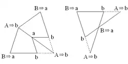 Mais on peut également, comme pour le pavage à l'aide des triangles d'or, définir un algorithme de « construction par découpage » consistant à chaque étape à découper chaque cerf-volant en deux cerfs-volants et deux demi-fléchettes et une fléchette en un cerf-volant et deux demi-fléchettes, et en agrandissant d'un facteur φ le résultat obtenu (remarquer que les sommets changent de nom à chaque étape, A devenant B et B devenant A).