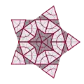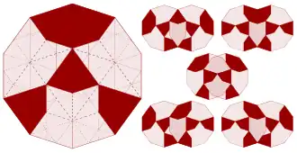 Le pavage construit autour de pentagones, P1, est en fait le premier découvert par Penrose, qui s'est inspiré d'abord des recherches de Johannes Kepler[7]. Il est bien connu qu'on ne peut couvrir le plan avec des pentagones réguliers, mais trois autres pièces suffisent pour combler les interstices, tout en imposant l'ordre apériodique. Ces pièces sont un losange fin, un pentagramme et un « bateau », qui représente à peu près les 3/5 d'un pentagramme. Pour la construction directe du pavage apériodique, il faut aussi distinguer trois sortes de pentagones. Une solution bien plus simple consiste à esquisser des pentagones sur les losanges fins et gros qu'on arrange en pavage de type 3.
