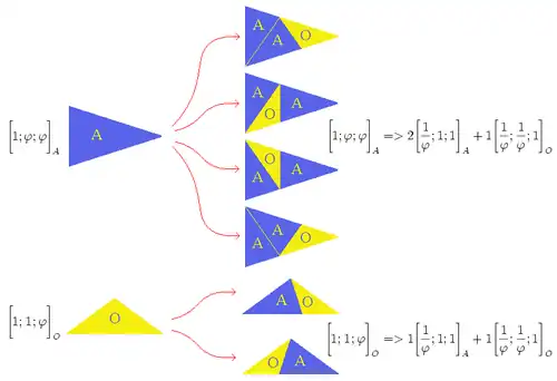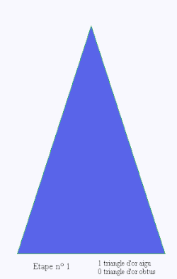 - En découpant un premier triangle d'or (aigu ou obtus, peu importe) et en opérant un agrandissement d'un facteur φ, puis en recommençant l'opération précédente une infinité de fois, on constitue un pavage complet du plan à l'aide des deux types de triangles d'or. Si, à l'étape n, on appelle le nombre de triangles aigus et le nombre de triangle obtus, on observe les formules de récurrence :