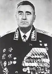 | Distinctions | Liste détaillée Ordre du Drapeau rouge (, , , et ) Ordre de Lénine (, , , et ) Ordre de Souvorov, 2e classe () Ordre de Koutouzov de 2e classe () Ordre de Koutouzov, 1re classe () Héros de l'Union soviétique () Médaille d'or de l'ordre du Mérite patriotique () Médaille du centenaire de la naissance de Lénine (en) () Ordre de la révolution d'Octobre () Ordre du Service pour la Patrie dans les Forces armées de 3e classe () Ordre de Klement Gottwald (en) () 100th Anniversary of the Birth of Georgi Dimitrov Medal (d) Ordre du 23 août, 1re classe (d) Ordre de la république populaire de Bulgarie (d) Ordre du Nuage et de la Bannière Ordre de Sukhe Bator Médaille de l'Amitié (d) Ordre du drapeau de la république populaire de Hongrie (en) Médaille du 30e anniversaire de la victoire à Khalkhin-Gol (en) Jubilee Medal "40 years of the Victory in Khalkhin-Gol" (d) Médaille «Pour le renforcement de la fraternité lors des combats» 1re classe (d) Médaille "Pour le renforcement de la fraternité d'armes» (d) Médaille des 30 ans de la victoire sur le Japon militariste (d) Jubilee Medal "60 Years of the Mongolian People's Army" (d) Médaille des 50 ans de l'armée populaire mongole (d) Jubilee Medal "50 Years of the Mongolian People's Revolution" (en) Medal "1300th Anniversary of Bulgaria" (en) Médaille « Pour le développement des terres vierges » (en) Commandeur avec étoile de l'ordre Polonia Restituta Médaille pour la prise de Königsberg Médaille pour la prise de Berlin Médaille de la libération de Varsovie Médaille pour la victoire sur le Japon Médaille du Jubilé des « 20 ans de la victoire dans la Grande guerre patriotique de 1941-1945 » (en) Médaille du 30e anniversaire de la Victoire sur l'Allemagne Médaille pour la victoire sur l'Allemagne dans la Grande Guerre patriotique de 1941-1945 Commandeur de l'ordre Polonia Restituta Médaille de la Libération de Prague Médaille « vétéran des forces armées de l'URSS » (en) Médaille du Jubilé des « 60 Ans des Forces armées de l'URSS » (en) Médaille du 800e anniversaire de Moscou (en) Médaille pour le renforcement de la fraternité dans les armes (en) Médaille du Jubilé des « 50 Ans des Forces armées de l'URSS » (en) Médaille du Jubilé des « 30 ans de l'Armée et la Marine soviétique » (en) Médaille du Jubilé des « 40 Ans des Forces armées de l'URSS » (en) Médaille de l'Amitié sino-soviétique (en) Médaille "Fraternité lors des combats" (d) |
