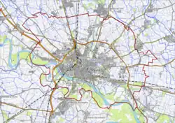 Le centre historique vu du ciel. Vous pouvez observer le tracé urbain régulier avec une structure orthogonale datant du Iersiècleav. J.-C. Pavie se dresse au bord de la puissante plaine inondable qui s'étend entre le Tessin et l'Olona, à une courte distance de la confluence du Tessin avec le Pô. Ce plateau est profondément gravé par d'autres cours d'eau mineurs. Le plateau diluvial sur lequel repose Pavie apparaît gravé, en correspondance avec l'aire urbaine, par deux sillons profonds dus à l'action érosive de deux fleuves postglaciaires, représentés aujourd'hui par le Navigliaccio (qui coule dans le lit autrefois occupé par Calvenza) et par le Vernavole. Les deux vallées ont tendance à converger juste derrière le site de la ville, de sorte que la Pavie primitive se trouvait sur un tronc ou une souche de terrasse presque isolé et difficile d'accès, de forme presque triangulaire, qui avait le Tessin au sud, le Calvenza puis le Navigliaccio au nord-ouest et la Vernavola au nord-est. La ville s'étage à différentes altitude. Le point culminant est situé dans la zone du château Visconti, à environ 80 mètres, puis décline lentement. D'une altitude de 80 mètres, on passe à 77 mètres en 500 mètres environ. En aval de la Piazza Vittoria, là où se croisaient le cardo et le decumanus de la cité romaine, la pente s'accentue, jusqu'à atteindre un peu moins de 60 mètres d'altitude près du Ponte Coperto[7].