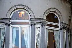 De part et d'autre du triplet, le dessus des baies barlongues est décoré de médaillons en relief. Un édicule à fronton brisé, abritant une horloge, domine la travée centrale. La corniche à modillons de la partie saillante est couronnée d'un attique rythmé par de petits socles surmontés de vases. Les travées latérales de l'étage sont percées de baies barlongues avec encadrement mouluré, surmonté d'un larmier.