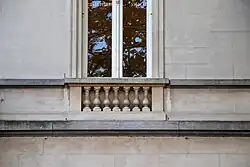 Enfin, cette dernière est précédée d'un balcon avec balustrade, soutenu par des consoles à volute et une balustrade identique précède les baies latérales de cette saillie.