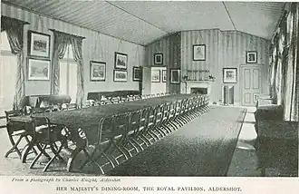 Le , la reine Victoria effectue sa première visite au Pavillon royal et, après avoir inspecté le camp, prend des rafraîchissements en son sein. Son premier séjour a lieu en 1856, à l'occasion de l'inspection des 14 000 soldats à Aldershot. La reine Victoria « était ravie de sa simplicité, des vues charmantes depuis ses fenêtres et de son isolement » et elle peint certaines de ces vues lors de ses visites à Aldershot. Cependant, un rédacteur de The Illustrated London News est moins enthousiaste, décrivant le Pavillon comme étant « trois côté d'un carré, chauve, froid et d'une laideur extrême. L'ensemble du Pavillon est entièrement construit en bois, pas une seule brique n'a été utilisée dans sa construction ».