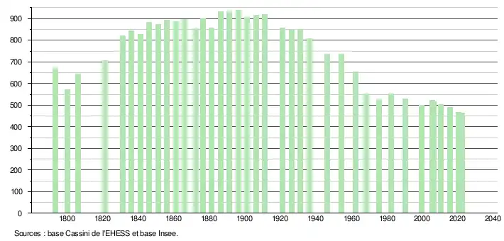 L'évolution du nombre d'habitants est connue à travers les recensements de la population effectués dans la commune depuis 1793. Pour les communes de moins de 10 000 habitants, une enquête de recensement portant sur toute la population est réalisée tous les cinq ans, les populations de référence des années intermédiaires étant quant à elles estimées par interpolation ou extrapolation[22]. Pour la commune, le premier recensement exhaustif entrant dans le cadre du nouveau dispositif a été réalisé en 2005[23].