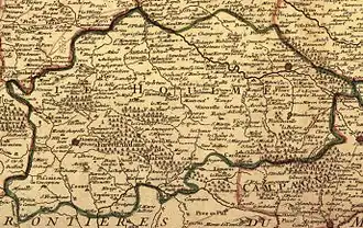 Le Grand dictionnaire français de J. de Guyot (1770) préfère indiquer : « borné au Nord par le Bocage, la Campagne de Caen et le Pays d’Auge, au midi par le Maine, à l’Orient par la campagne d'Alençon et à l’Occident par l’Avranchin » [soit 11 lieues de longueur et 8 de largeur].