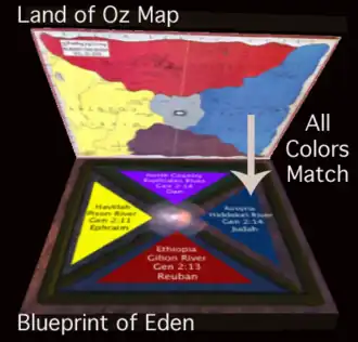 Une autre théorie prétend qu'Oz est le reflet de l'Éden, organisé selon le symbolisme connu sous le nom de Merkabah. « Baum reflète la carte de l'Éden correspondant aux structures émotionnelles humaines par les images que nous nous faisons à travers le portrait des quatre personnages »[13]. Les symboles de la Merkabah, l'Homme, le Taureau, le Lion et l'Aigle, sont transposés, respectivement, dans les personnages de Dorothy, Tin Woodman, Lion et Scarecrow.