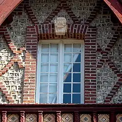 - ↑ Un motif ornemental en stuc apposé sur le linteau en briques de cette baie, simule une clef de voûte décorative.