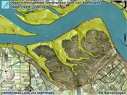 La région comptait quatre villages : Saeftinghe, Namen, Saint-Laureins et Casuwele et plusieurs hameaux. La zone a été dès le XIIe siècle régulièrement menacée par les inondations. Lors de l'inondation de la Toussaint en 1570, déjà elle était presque entièrement inondée. Quatre ans plus tard une nouvelle inondation va jusqu'à Verrebroek et Kallo en Belgique. Seuls la ville de Saeftinghe et quelques bâtiments restent hors d'eau comme la tour de Namen. Les cloches ont été retirées de la tour et remontées dans le village voisin de Graauw. Le fort a continué à servir comme péage temporaire. Au cours de la guerre de Quatre-Vingts Ans, elle servait de base stratégique, en 1584 des soldats néerlandais ont été obligés de rompre une digue et la ville fut inondée. Au XVIIe siècle des digues ont été reconstruites, et en 1907 le Hedwigepolder est le dernier polder reconquis sur la mer. Maintenant le hameau Getijhaven est au bord du marais.