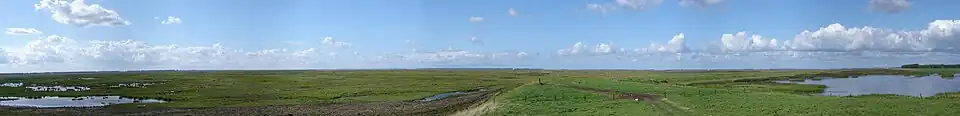 La zone est couverte à 70 % avec des plantes de marais et des roseaux. Le reste est constitué de bancs de sable, des ravins et de ruisseaux. Le passage de la zone salée à la zone d'eau douce se fait progressivement, la partie ouest étant plus salée que l'est. La zone des marais salés a développé une flore typiques des zones saumâtre. Des espèces comme la Cochléaire officinale, l'aster, dos, la troscart maritime, la puccinellia, sont souvent rencontrés. Moins fréquents sont le céleri, l'écran d'or fin, l'herbe longue barbe et la belle centaurée. Lorsque le marais salant vieillit et s'adoucit, la végétation se modifie. Les plantes typiques des prés-salés sont alors par endroits remplacées par des roseaux. Dans la partie orientale de la région se trouvent de vastes roselières. De grandes parties du pré-salé servent de pâture à des bœufs, ce qui profite surtout aux plantes de pré-salé, réduisant ou arrêtant de ce fait l'extension des roseaux.