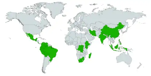 Le Centre mondial de surveillance pour la conservation de la nature (UNEP-WCMC), une agence du programme des Nations unies pour l'environnement, a identifié dix-sept pays mégadivers, la plupart situés dans les tropiques[6]. La liste complétée ajoute la Papouasie-Nouvelle-Guinée, l'Afrique du Sud, les États-Unis, le Congo, les Philippines et le Venezuela[5].