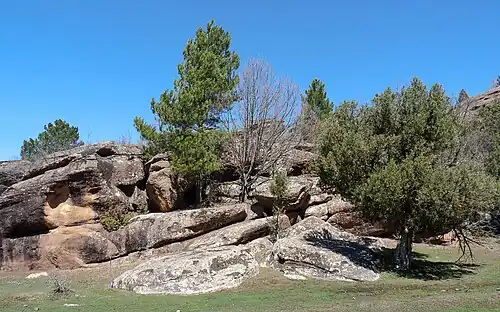 Enfin, dans les zones calcaires, le pin rodeno cède la place au Pinus nigra et au pin sylvestre, le Juniperus thurifera et le Juniperus sabina étant également également abondants.