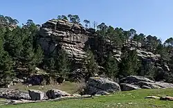 Formes géologiques des ravins. Le sol des pinèdes est formé sur un substrat de grès rouge, appelé rodeno dans le système ibérique. Parmi les formes modelées par les agents atmosphériques, il convient de souligner les gorges creusées par les cours d'eau, les taffoni (trous hémisphériques dans la paroi rocheuse) ou les pilancones (grandes dépressions circulaires dans la surface rocheuse).
