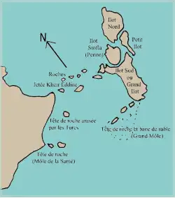 De la partie du littoral située en face de ce groupe, et qui, à cet endroit, se projette fortement vers le nord, part une série de récifs qui, suivant la direction de la rue actuelle de l’Amirauté, aboutissent au point d’intersection des deuxième et troisième îlots. Une ligne d’écueils moins longue existe encore sous le bâtiment de la Santé. Ces deux lignes et celle des îlots constituaient la charpente de la darse que Barberousse créa, après la prise du Peñon, en remplissant, avec les décombres provenant de la partie principale de cette forteresse, les intervalles qu’il y avait entre ces différentes têtes de roches.