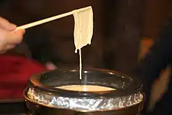 « Si un film se forme à la surface du lait de soja lorsque celui-ci est chauffé pour obtenir du tofu, ce film doit être retiré et séché pour obtenir du doufu pi (littéralement « peau de soja caillé ») qui est en lui-même un délicieux ingrédient culinaire. »