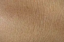 La peau humaine est un des organes les plus grands du corps, en termes de poids (5 à 10 % de la masse corporelle totale d'un adulte moyen suivant la taille ou la corpulence, le double si l'on prend en compte le tissu adipeux sous-cutané) et de surface d'échange[1] ; chez l'adulte sa surface est d'environ 1,8 m2[2],[3], son épaisseur varie de 0,5 mm (paupières) à 4-5 mm (haut du dos notamment)[4]. Sa surface d'échange est cependant bien plus petite que celle du poumon (140 m2) ou de l'intestin (300 à 400 m2, environ deux terrains de tennis) et elle est bien moins perméable[5]. Elle est l'habitat du microbiote cutané humain.