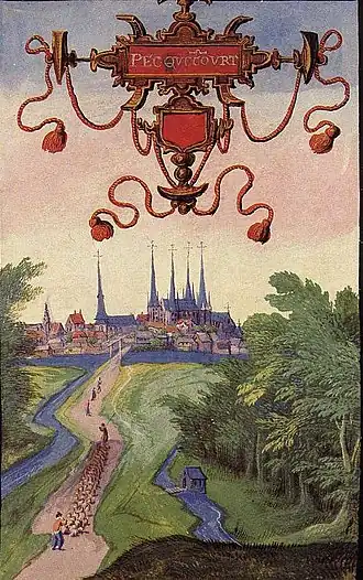 - ↑ Il y a aussi une belle représentation de l'Abbaye d'Anchin dans les Albums de Croy — J.-M. Duvosquel, Albums de Croÿ, 26 vol. grand in-4°, Bruxelles, Crédit communal de Belgique, 1985-1996 (pour les t. I à XXV, il existe également un tirage daté de Lille, Conseil régional du Nord Pas-de-Calais, 1985-1991). Le t. XXVI (Bruxelles, 1996) qui clôture l'édition, regroupe une série d'études sur les albums. L'édition totalisant 7 510 pages reproduit les 2 544 planches d'albums et les 28 planches d'un carnet de croquis ainsi que plusieurs centaines d'illustrations enrichissant les textes introductifs qui ouvrent chaque volume. Bernard Delmaire a collaboré à cette vaste entreprise en rédigeant plusieurs études relatives au comté d'Artois (t. XVII, XX, XXI, XXIII à XXV).