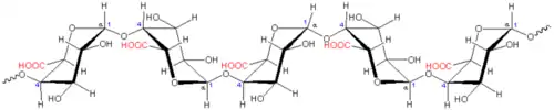 Les homogalacturonanes sont la principale chaîne qui compose les pectines (représentant en règle générale plus de 60 % des pectines)[3]. Ce sont des polymères d’acide α-D-galacturonique liés en (1→4). La longueur de ces chaînes peut aller de 70 à 100 résidus d’acide galacturonique dans le citron, la betterave sucrière ou dans la pomme[5], c’est-à-dire présentant des masses molaires de l’ordre 12 à 20 kDa. La fonction carboxylique des acides α-D-galacturoniques peut être sous forme acide, ou ionisés par différents cations dont le calcium, ou estérifiée par du méthanol. Par ailleurs les acides galacturoniques peuvent être acétylés en O-2 et /ou O-3[3]. En fonction de ces estérifications, les pectines sont caractérisées par un degré de méthylation (DM) et un degré d’acétylation (DA) qui correspond au rapport des acides galacturoniques estérifiés (méthylés ou acétylés) sur les acides galacturoniques totaux. D’un point de vue fonctionnel, on distingue trois catégories de pectines :