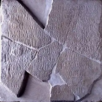 Il s'agit d'une inscription métrique grecque, de trois distiques et cinq hexamètres, gravée sur une tablette de marbre cassée en sept morceaux, mais assez complète pour permettre une restitution utile du texte.