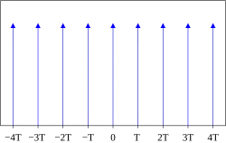 Par l'utilisation de la formule sommatoire de Poisson, on peut montrer que la transformée de Fourier du peigne de Dirac en temps est également un peigne de Dirac, en fréquence :