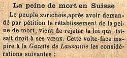 - 1 2 « La peine de mort en Suisse », Le Courrier de Genève, , p. 1 (lire en ligne, consulté le ).