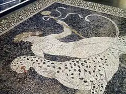 - ↑ Plusieurs épisodes de la bataille d'Issos entre Alexandre le Grand et le Perse (achéménide) Darius III. Sans doute d'après une peinture de Philoxénos d'Érétrie ? seconde moitié du IVe siècle(Manuel de l'École du Louvre, 1998/2011 ; page 229). L'un des peintres les plus célèbres de son temps.