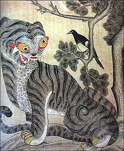 Pierre Cambon (dir.), Tigres de papier : Cinq siècles de peinture en Corée, Gand et Paris, Snoeck et Musée national des arts asiatiques - Guimet, , 227 p., 30 cm. (ISBN 978-94-6161-255-7 et 979-10-90262-28-7). Ces cinq siècles sont ceux de la Période Joseon, 1392 - 1910.