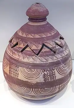 - les décors figuratifs (plantes, animaux et, rarement, figure humaine). Ces dernières sont généralement présentées sous une forme stylisée et géométrique, mais les figures réalistes, fantastiques ou monstrueuses ne manquent pas. Dans ces compositions, toujours brèves ou réduites, il n'y a pas de traces de perspective ou de contrastes de clair-obscur, ni de détails de perfection technique dans le dessin, bien qu'il y ait parfois des silhouettes d'animaux bien dessinées dans des attitudes très émouvantes. Lorsque ces figures existent, elles sont presque toujours disposées en superpositions ou en zones horizontales autour du vase, imitant de loin les vases corinthiens.