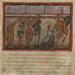 Entre le IVe siècle, sous le règne de l'empereur Constantin Ier, et le VIIe siècle qui correspond au début de l'iconoclasme, période que l'on appelle le premier art byzantin, la production picturale se caractérise par un mélange de tradition romaine, de tradition orientale et de christianisme. Si la fresque reste toujours majoritaire, apparait la peinture sur bois avec l'art des Icônes. Les thèmes abordés par l'art de cette période qui connaît son apogée sous le règne de Justinien Ier (527-565), sont d'un grand conservatisme, avec des œuvres représentant des scènes classiques de l'art romain. Rares sont les peintures qui ont résisté au temps mais les dignitaires religieux étaient favorables aux peintures religieuses dans les lieux de culte perçues comme un moyen de diffuser la religion[18]. On retrouve en revanche de nombreuses mosaïques d'époque notamment dans les édifices religieux de Constantinople, et aussi à Rome. Toutefois, un nombre important de manuscrits enluminés nous sont parvenus avec des peintures narratives illustrant des auteurs classiques, tels que Virgile ou Homère, ou des manuscrits bibliques dont ne survivent que quelques fragments comme l'Itala de Quedlinbourg qui illustrait du Premier livre des Rois[19] ou encore au cours de la première moitié du VIe siècle, la Genèse de Vienne[20], l'évangéliaire de Rossano[21], et le Codex Sinopensis[22], ainsi que le Dioscoride de Vienne, un traité de botanique illustré[23].