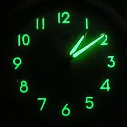 En raison de problèmes de sécurité et d’une réglementation plus stricte, les produits de grande consommation tels que les horloges et les montres utilisent de plus en plus de substances phosphorescentes plutôt que radioluminescentes. Auparavant, les peintures radioluminescentes étaient largement utilisées sur les cadrans de montres et d’horloges et étaient familièrement connues des horlogers sous le nom de « clunk »[1]. La peinture radioluminescente peut encore être préférée dans des applications spécialisées, telles que les montres de plongée[2].