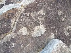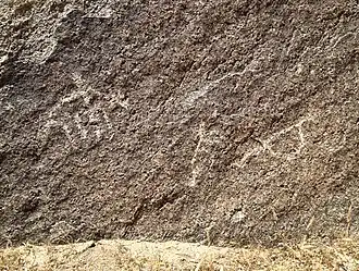 Parmi les pétroglyphes, se trouvent des représentations d'animaux tels que la chèvre, le sanglier, le cerf, le cheval, le chameau, le chien, le serpent, et aussi de personnages humains (dont des cavaliers), des mains, différents objets dont des (armes), et des lettres en arabe. Parmi les figures d'animaux, celle de la chèvre est très fréquente et à cet égard, I. Soukharev observe que ce mammifère ne se trouve pas dans cette région et que l'image aurait donc un lien avec un culte[2]. La conception des dessins est très variable, depuis de simples silhouettes à des formes géométriques aplaties qui ne disposent pas de toutes les parties du corps[5],[6].